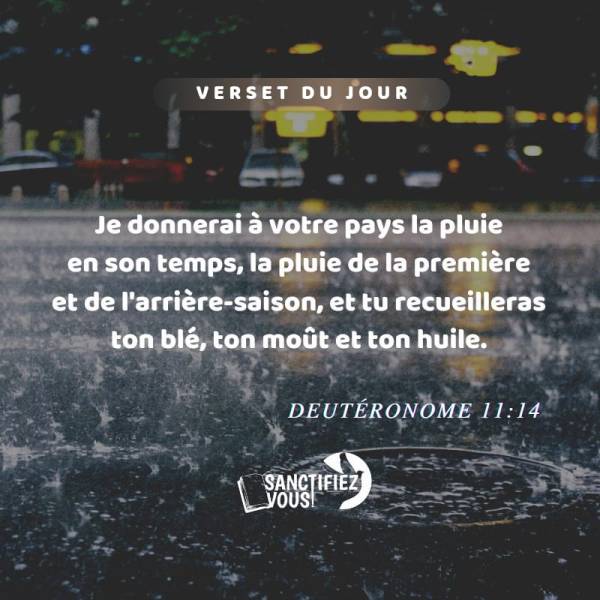 Je donnerai à votre pays la pluie en son temps, la pluie de la première et de l'arrière-saison, et tu recueilleras ton blé, ton moût et ton huile. Deutéronome 11:14 Vèsè jounen an 📖M'a voye lapli sou tè nou lè n'a bezwen l'. M'a bay lapli nan sezon plante ak nan sezon rekòt pou nou... Lire la Suite →