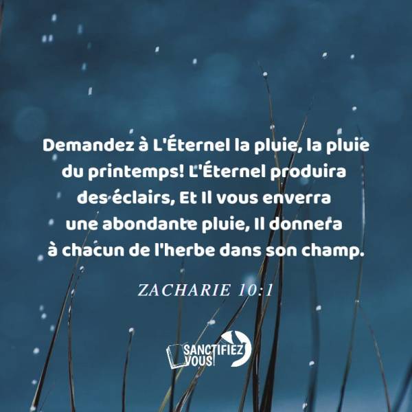Demandez à L'Éternel la pluie, la pluie du printemps! L'Éternel produira des éclairs, Et Il vous enverra une abondante pluie, Il donnera à chacun de l'herbe dans son champ. Zacharie 10:1 Dans la Bible, la pluie symbolise la bénédiction et la faveur de Dieu. Ainsi, bien aimé(e), demandez à Dieu de vous envoyer de la... Lire la Suite →
