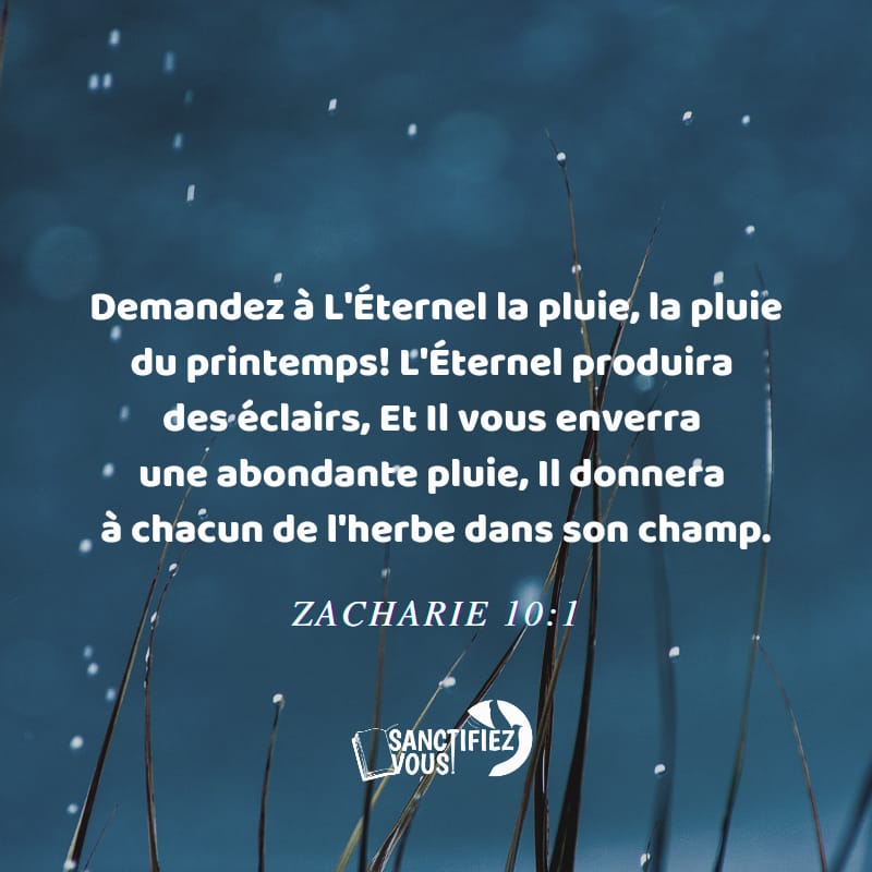 Demandez à L’Éternel la pluie, la pluie du printemps! L’Éternel produira des éclairs, Et Il vous enverra une abondante pluie, Il donnera à chacun de l’herbe dans son champ. Zacharie 10:1