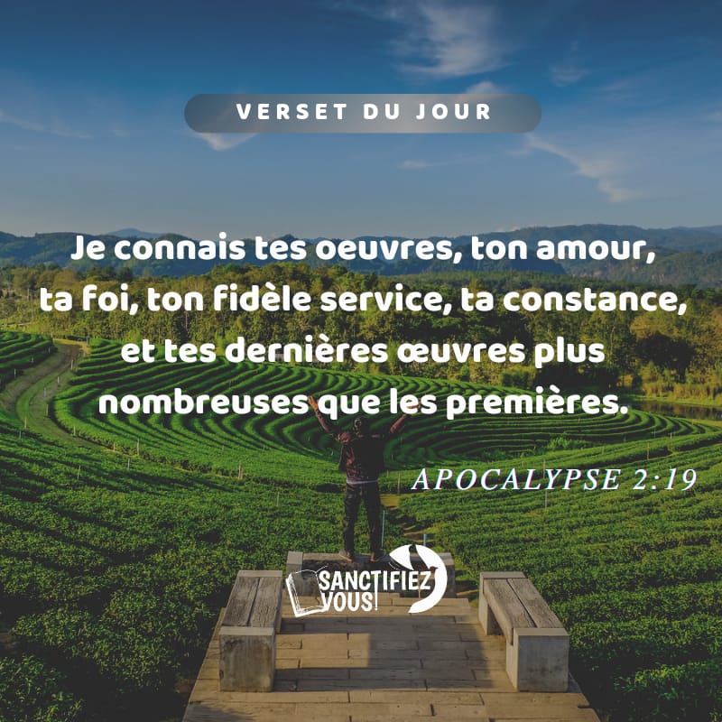 Je connais tes Ćuvres, ton amour, ta foi, ton fidĂšle service, ta constance, et tes derniĂšres Ćuvres plus nombreuses que les premiĂšres. Apocalypse 2:19