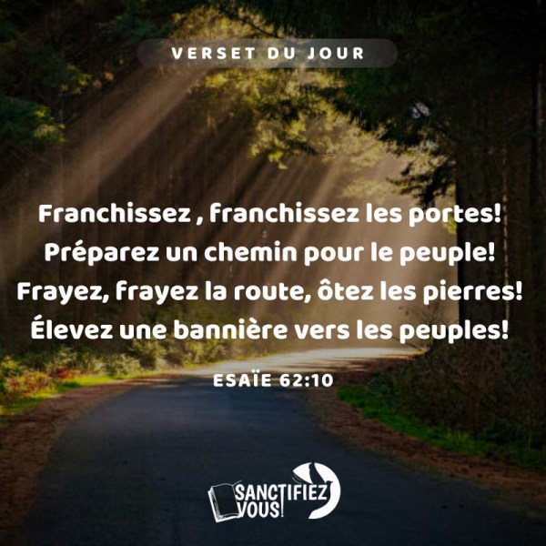 Franchissez, franchissez les portes ! Préparez un chemin pour le peuple ! Frayez, frayez la route, ôtez les pierres ! Élevez une bannière vers les peuples ! Esaïe 62:10 Vèsè jounen an 📖Nou menm moun lavil Jerizalèm, pase nan pòtay la, soti nan lavil la ! Al pare wout la pou pèp la tounen. Ranbleye... Lire la Suite →