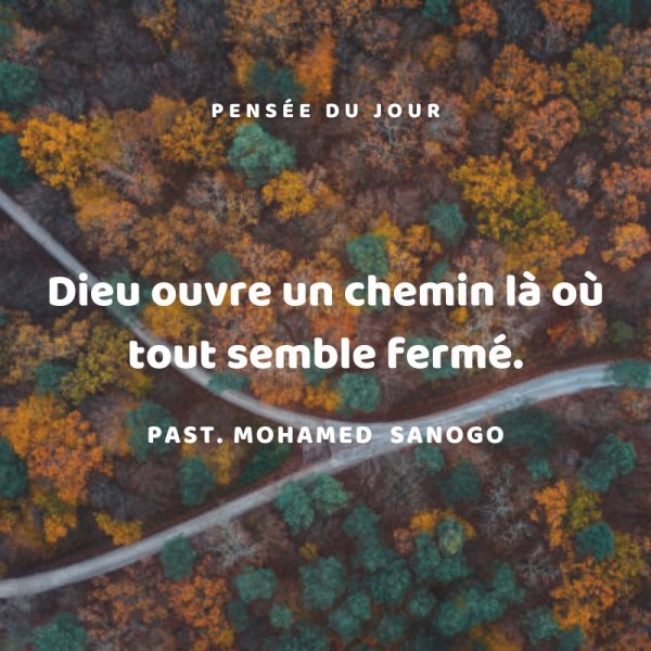 Dieu ouvre un chemin là où tout semble fermé. Past. Mohamed SANOGO Panse pou jounen an 🧠BonDye louvri chimen kote ki sanble pa gen wout. Past. Mohamed SANOGO Pour recevoir quotidiennement les messages de SANCTIFIEZ-VOUS, suivez notre chaîne Whatsapp via ce lien : https://whatsapp.com/channel/0029VaDA6tCAO7RHYUrDS428