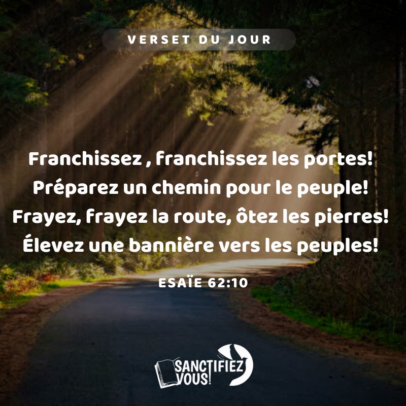 Franchissez, franchissez les portes ! PrĂ©parez un chemin pour le peuple ! Frayez, frayez la route, ĂŽtez les pierres ! Ălevez une banniĂšre vers les peuples ! EsaĂŻe 62:10