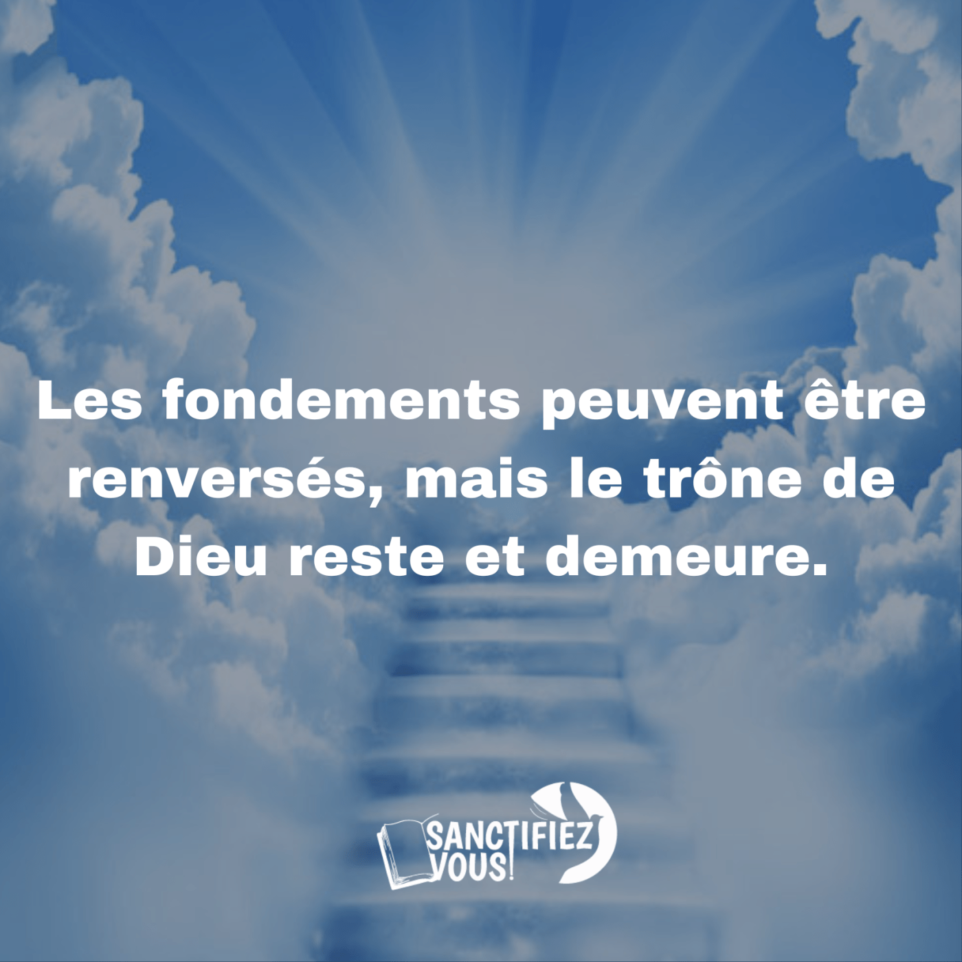 Conseils : Les fondements de la justice, du droit, de l’amour s’effondrent partout. Cependant le trône de Dieu reste inébranlable. Ainsi, le juste doit fixer ses regards sur Dieu seul car Il est inébranlable.
