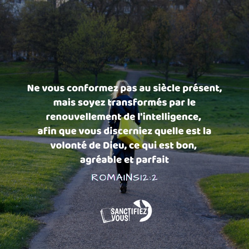 Ne vous conformez pas au siècle présent, mais soyez transformés par le renouvellement de l’intelligence, afin que vous discerniez quelle est la volonté de Dieu, ce qui est bon, agréable et parfait. Romains12:2