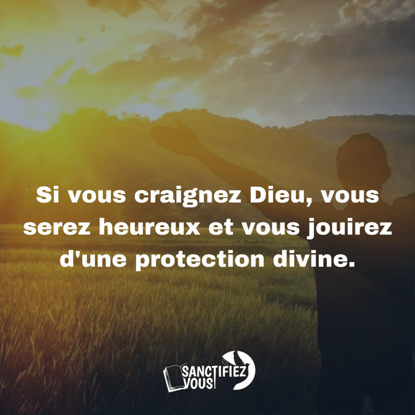 Leçon : Craindre Dieu, c’est d’avoir pour Dieu un profond respect parce qu’Il est Dieu, Le Tout Puissant; c’est L’honorer pour sa gloire, sa sainteté, sa majesté, et sa puissance; c’est aussi reconnaître que sa Sainteté et sa Justice vont de pair avec Son Amour et sa Miséricorde. Une telle crainte est fondée sur le fait de savoir que Dieu est Saint et qu’en tant que tel, Il ne peut rien faire d’autre que de juger le péché. Dans ce passage, craindre Dieu, c’est d’obéir à ses commandements afin d’être heureux et de jouir de la protection divine.