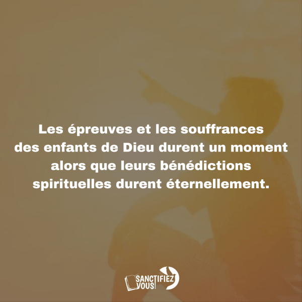 Les épreuves vous gardent dans l'humilité et vous apprennent à laisser le contrôle à Dieu et à dépendre davantage de Lui. Aussi, elles vous perfectionnent lorsque vous les abordez avec une perspective divine et préparent votre caractère pour le rendre capable de supporter le poids des bénédictions que Dieu a prévues pour vous.