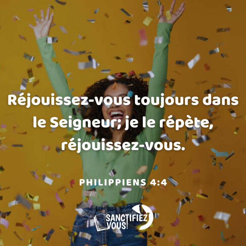 Réjouissez-vous toujours dans le Seigneur; je le répète, réjouissez-vous. Philippiens 4:4