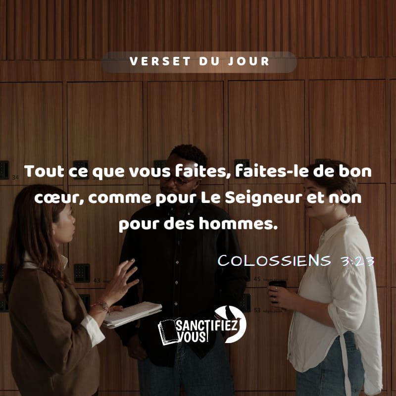 Tout ce que vous faites, faites-le de bon cĆur, comme pour Le Seigneur et non pour des hommes. Colossiens 3:23
