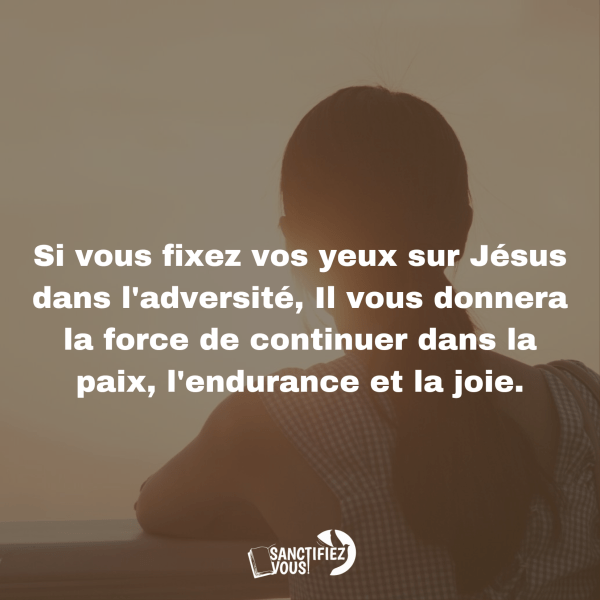 Regarder vers Jésus signifie compter sur Lui. Jésus est notre encouragement dans cette course, à la fois comme notre exemple et comme notre aide. Si vous fixez vos yeux sur Jésus à chaque fois que vous vous sentez découragés ou frustrés, ou que vous avez envie d’abandonner, Il vous donnera la force de continuer dans la paix, l’endurance et la joie.