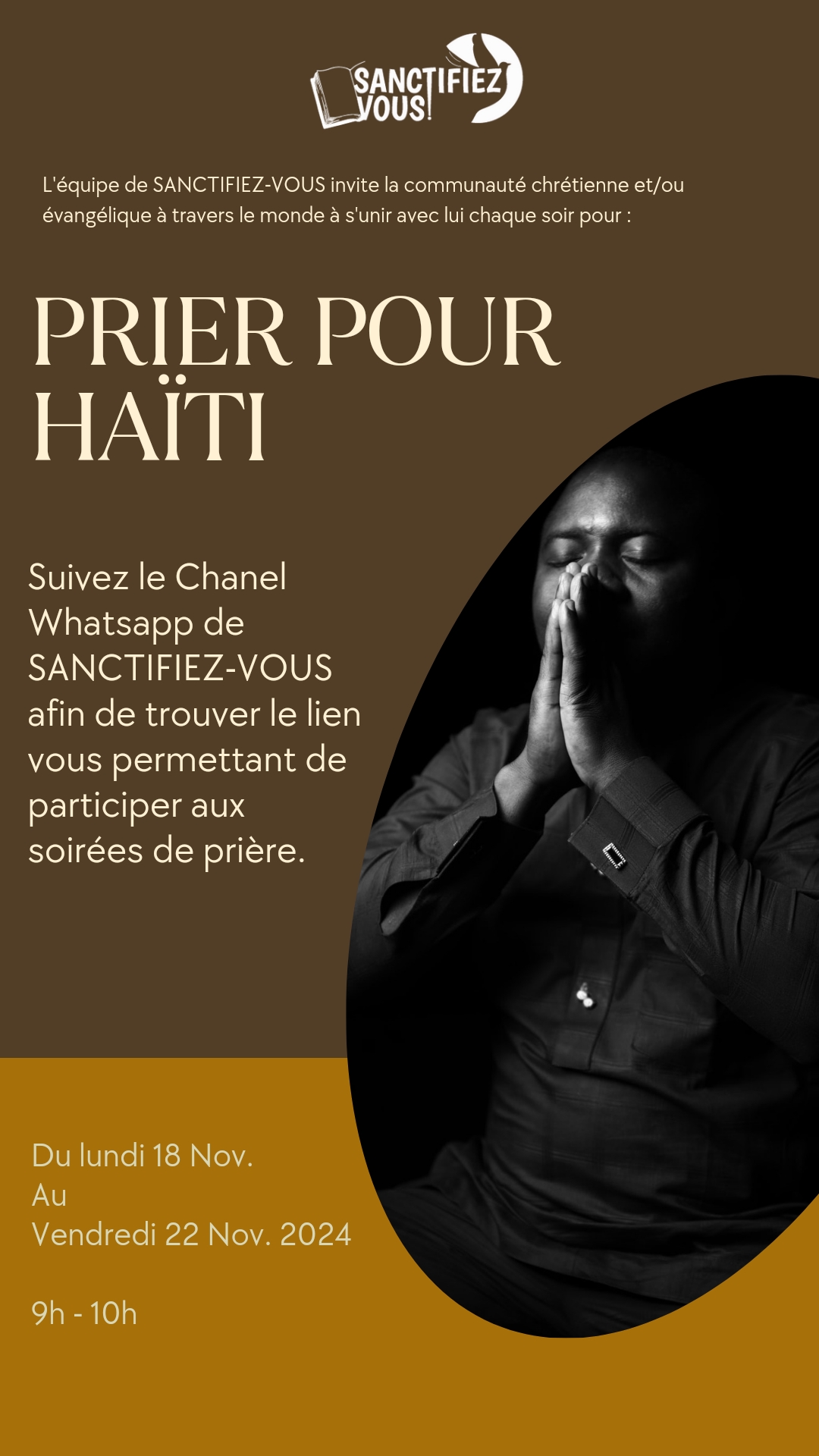 Cette semaine (lundi 18 – vendredi 22 novembre 2024), l’équipe de Sanctifiez-vous invite la communauté chrétienne et/ou évangélique à travers le monde à s’unir avec lui chaque soir, de 9h à 10h, heure haïtienne, pour prier pour Haïti.