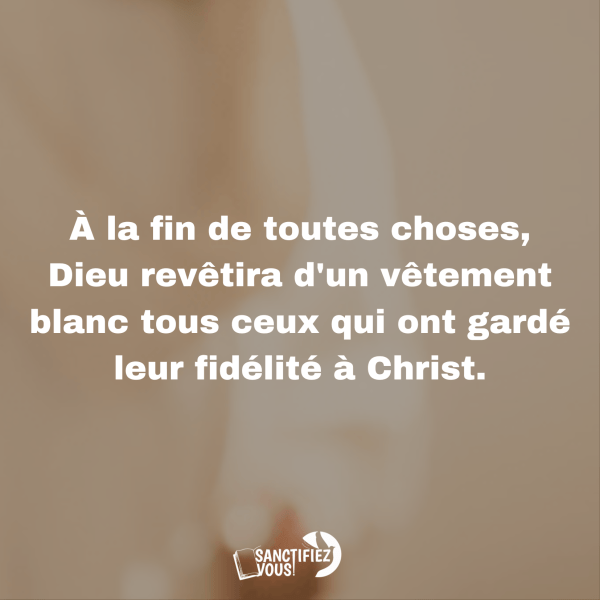 Dans son royaume, Dieu revêtira de robes blanches comme symbole de pureté, de justice et de victoire spirituelle, tous ceux qui ont gardé leur fidélité à Christ malgré les épreuves et les souffrances qu'ils ont pu rencontrer durant leur vie sur terre.