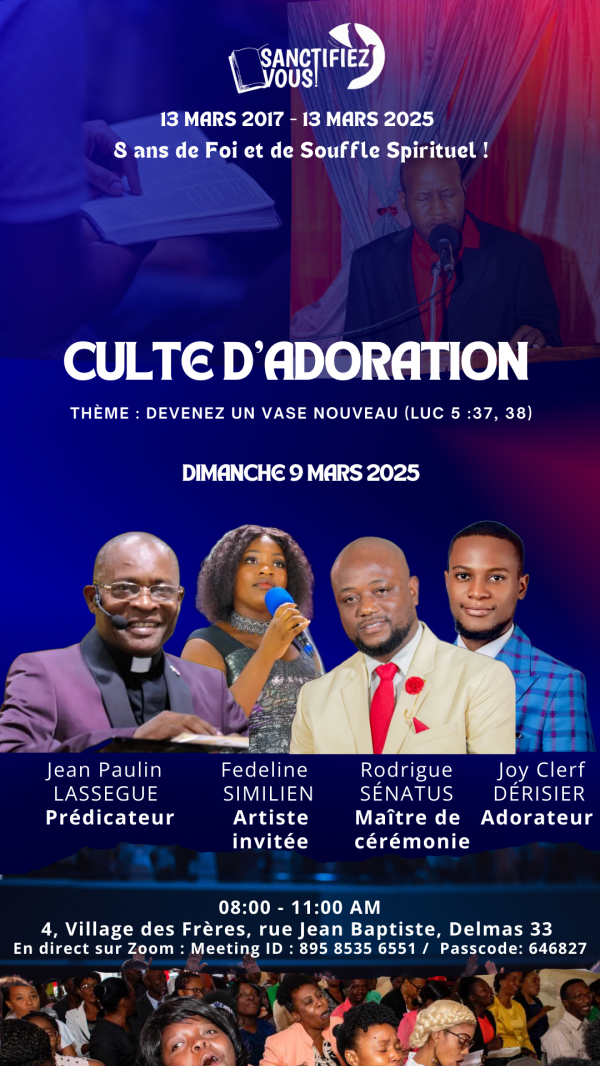 INVITATION13 Mars 2025 marquera la 8ème année d’existence du ministère Sanctifiez-vous. En cette circonstance, un culte spécial sera organisé le dimanche 9 Mars 2025, de 8h am – 11h am (heure d’Haïti), à l’église Assemblée Chrétienne par la Foi de Delmas, sise au #4, impasse des Frères, rue Jean Baptiste, Delmas 33.Ainsi, nous vous invitons... Lire la Suite →
