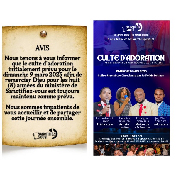 Chers frères et sœurs,Nous tenons à vous informer que le culte d'adoration initialement prévu pour le dimanche 9 mars 2025 afin de remercier Dieu pour les huit (8) années du ministère de Sanctifiez-vous est toujours maintenu comme prévu, de 8h am – 11h am (heure d’Haïti), à l’église Assemblée Chrétienne par la Foi de Delmas,... Lire la Suite →