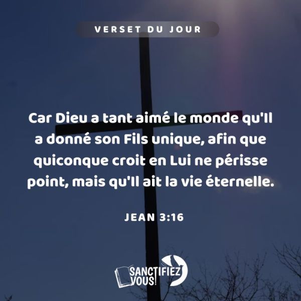 Car Dieu a tant aimé le monde qu'Il a donné son Fils unique, afin que quiconque croit en Lui ne périsse point, mais qu'Il ait la vie éternelle. Jean 3:16Vèsè jounen an 📖Paske, BonDye sitèlman renmen lèzòm li bay sèl Pitit li a pou yo. Tout moun ki va mete konfyans yo nan li p... Lire la Suite →