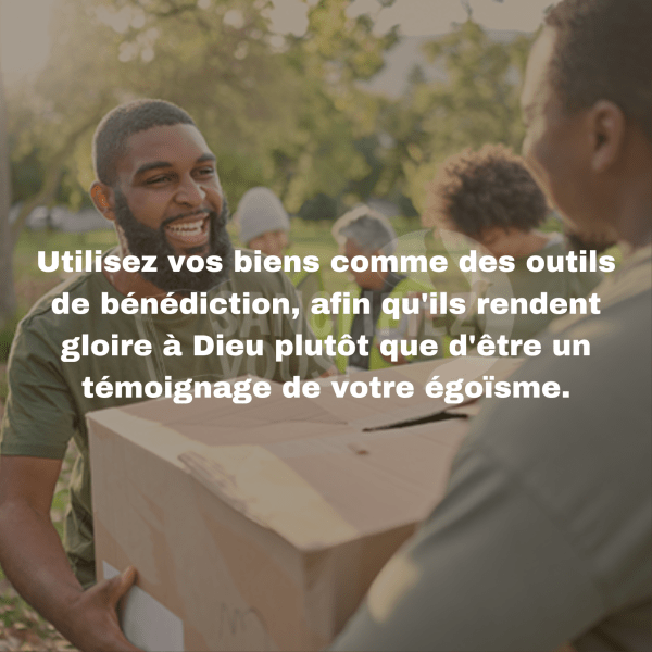 Nos biens matériels peuvent devenir soit un outil pour le bien, soit une preuve de notre égoïsme devant Dieu. Utilisons-les pour la gloire de Dieu et pour bénir les autres, car leur valeur terrestre est éphémère.