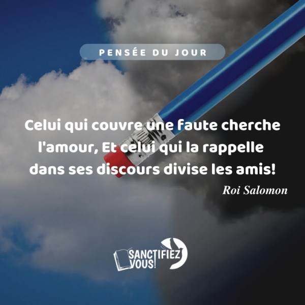 Celui qui couvre une faute cherche l'amour, Et celui qui la rappelle dans ses discours divise les amis. Roi SalomonPanse pou jounen an 🧠Si ou vle moun renmen ou, padonnen lè yo fè ou mal. Si w'ap mache repete bagay moun fè ki mal, w'ap mete zanmi dozado. Wa Salomon