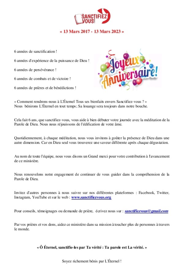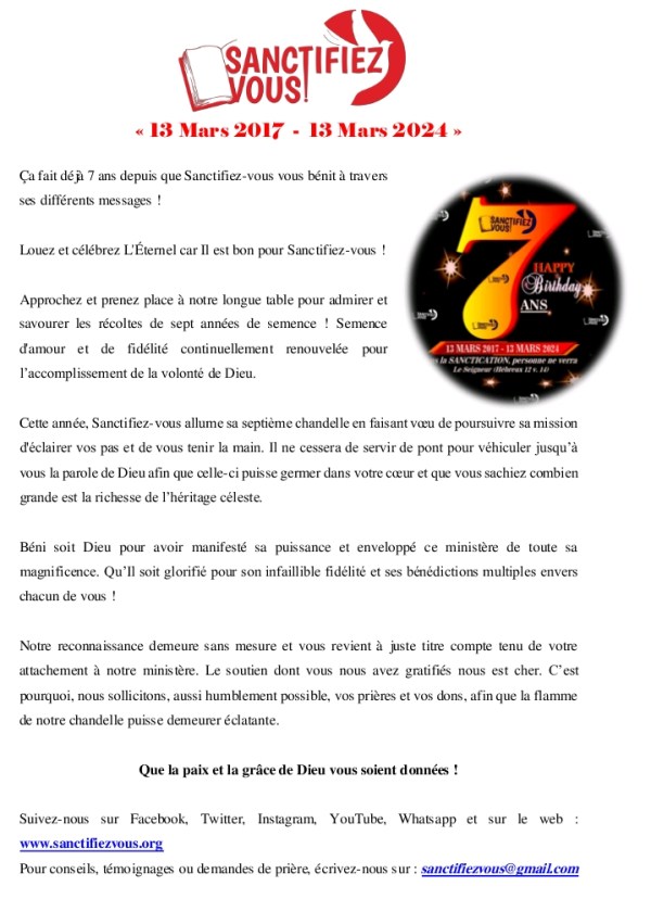 À l'occasion de son 7ème anniversaire, l'équipe de Sanctifiez-vous remercie Dieu pour avoir manifesté sa puissance et enveloppé ce ministère de toute sa magnificence. Qu’Il soit glorifié pour son infaillible fidélité et ses bénédictions multiples envers chacun de vous, nos chers lecteurs (rices)!