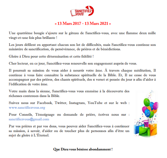 « 13 Mars 2017 - 13 Mars 2021 » Une quatrième bougie s'ajoute sur le gâteau de Sanctifiez-vous, avec une flamme deux mille vingt-et-une fois plus brillante ! Les jours défilent en apportant chacun son lot de difficultés, mais Sanctifiez-vous continue son ministère de sanctification, de persévérance, de prières et de bénédictions. Gloire à Dieu... Lire la Suite →