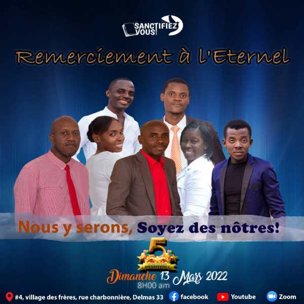 13 Mars 2022, Sanctifiez-vous souffle sa 5ème bougie. De ce fait, nous vous invitons à venir célébrer et bénir Le Nom de Dieu dans un culte d'adoration avec l'équipe de Sanctifiez-vous de 8h am - 11h am (heure d'Haïti), à l'église Assemblée Chrétienne par la Foi de Delmas, sise au #4, impasse des Frères, rue Charbonnière, Delmas 33.